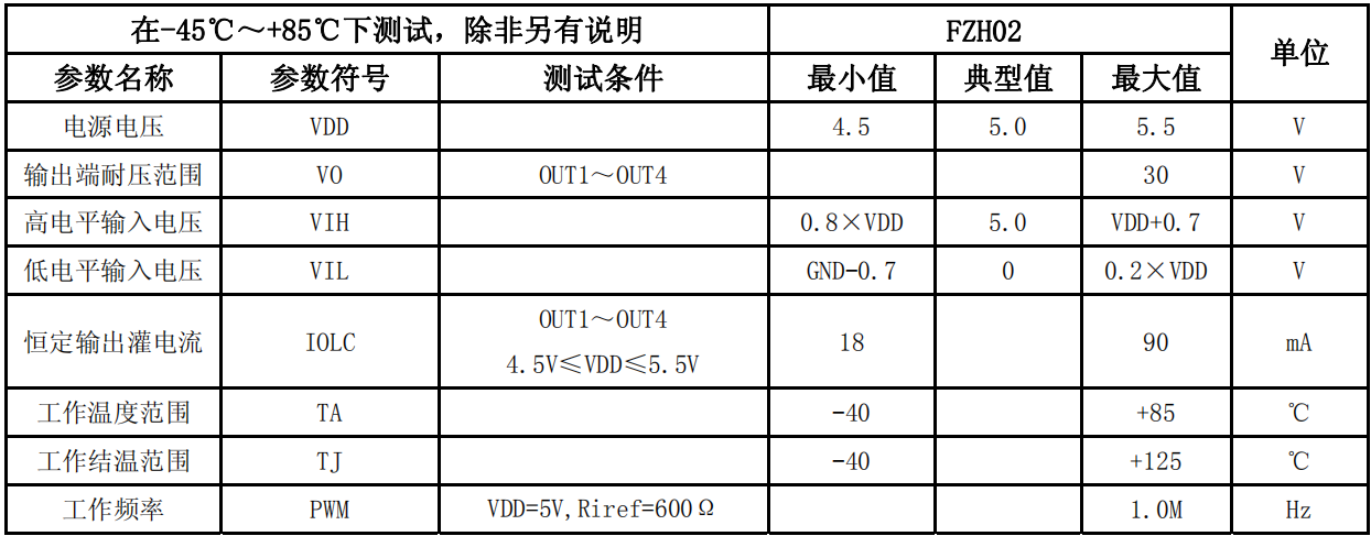 (1)以上表中这些等级不能让芯片长时间工作在极限值,芯片长时间工作在极限值下,容易降低器件的可靠性,可能 会出现永久性损伤。不建议在其它任何条件下,芯片超过这些极限参数工作。