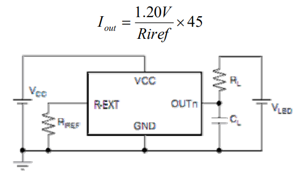 如下图所示,由外接一个电阻(Rext)调整输出电流(IOUT),套用下列公式可计算出输出电流值: