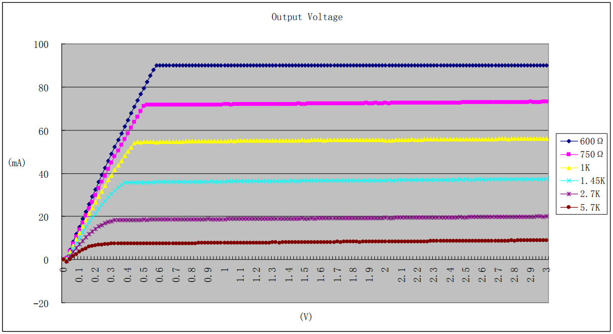 公式中的Riref是指R-EXT端的电阻。当电阻值是 600Ω,通过公式计算可得输出电流值 90mA;当电阻值是 1KΩ时,输出的电流则为 54mA。