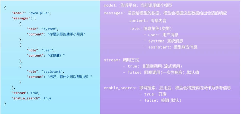 使用大模型需要传递的参数,在访问大模型时都需要在请求体中以 json 的形式进行传递。