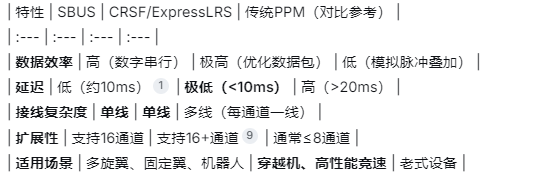 CRSF/ExpressLRS:新兴的高性能开源协议,以高刷新率(最高可达333Hz)、低延迟和远距离著称,是穿越机和专业应用的流行选择。