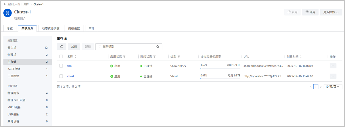 - 1个Vhost主存储 + 多个Shared Block主存储。(注意:Vhost和SharedBlock存储仅支持同集群共存,不支持云主机在Vhost和SharedBlock存储间迁移)