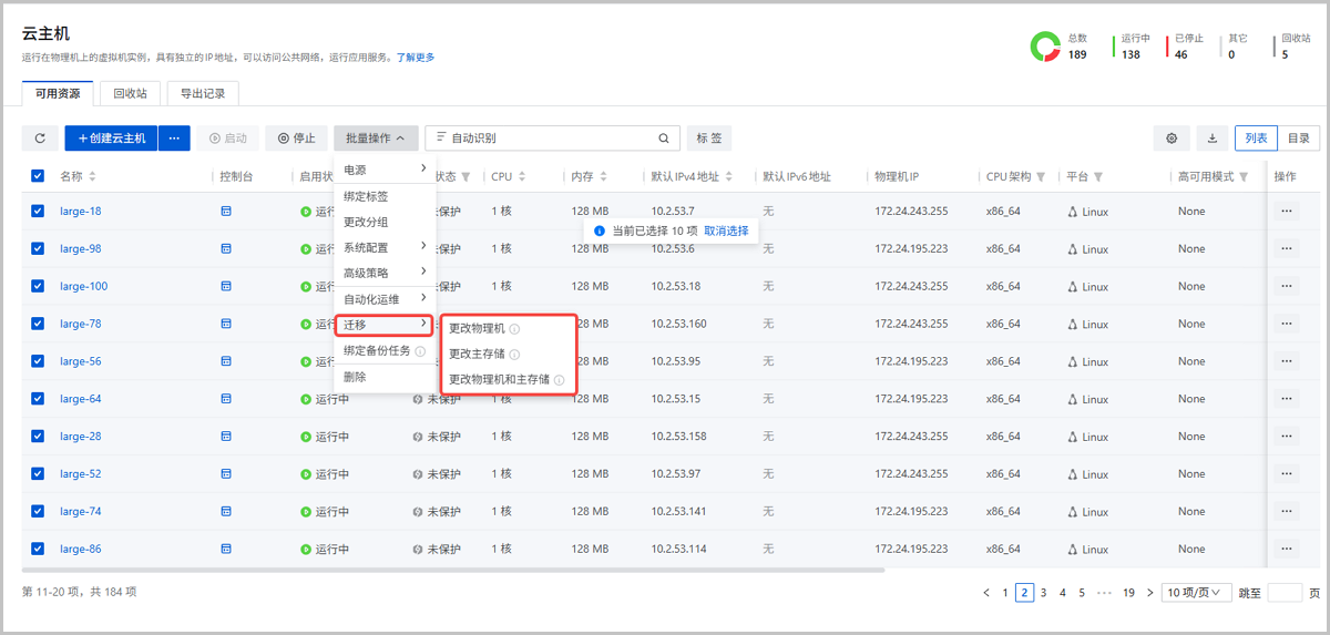 - 支持批量迁移云主机:将批量云主机一键迁移到目标物理机或主存储,降低计划性维护、存储扩容等大规模运维难度,切断业务中断风险。