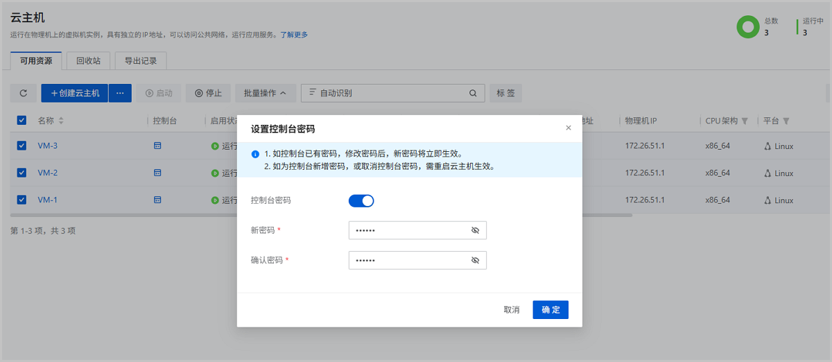 ZStack Cloud 5.5.0开始,支持批量设置云主机控制台密码、切换云主机控制台模式,有效提升大规模运维效率。