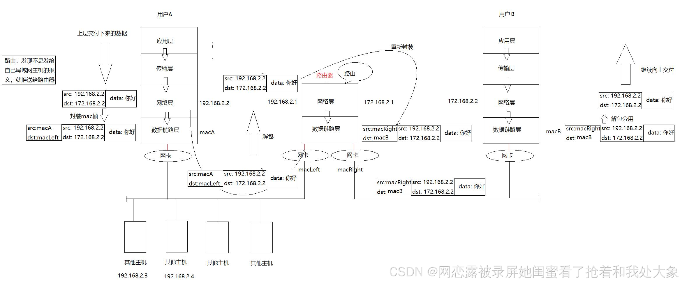 - 用户A向用户B发送数据,用户A发送的数据进行封装,到达网络层时,通过路由,发现源目标IP不在这个局域网中,就把该数据发送给路由器,源mac地址是本主机的mac地址,目标mac地址是路由器的mac地址,在局域网当中其他的主机也能够收到该数据,但是在其他主机的数据链路层发现目标mac地址不是本主机,其他主机会自动丢弃该数据。