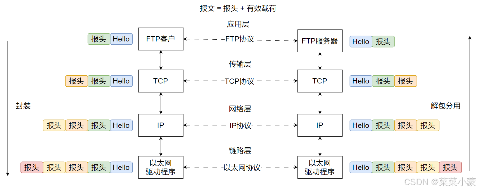 - 不同的协议层对数据包有不同的称谓,在传输层叫做段(segment),在网络层叫做数据报 (datagram),在链路层叫做帧(frame).