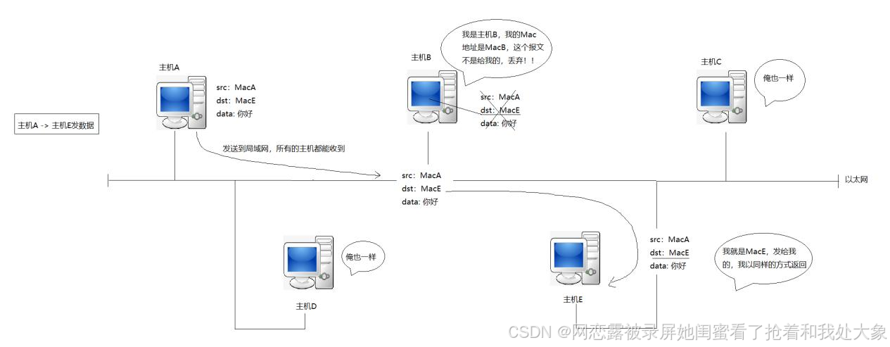 详细过程:主机A要向主机E发送数据,先将数据发送到局域网中,该局域网网中的设备都有都会收到这条信息,主机B解析目标mac地址不是主机B,直接丢弃该数据,主机C和主机D同样也是,主机E接收到该数据,就会解析该目标mac地址,发现MAC地址是自己,会接受该数据。
