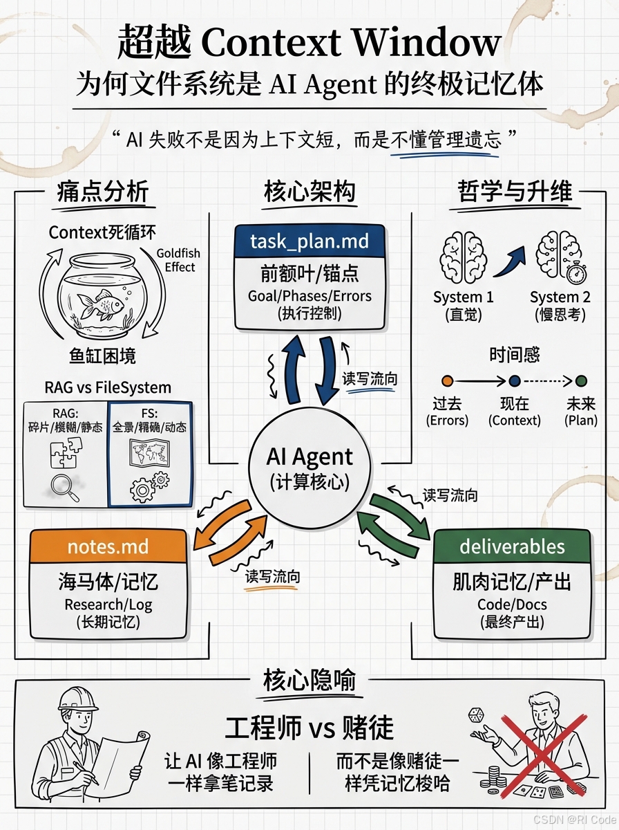 - 文件系统强化的循环是 System 2:规划、记录、反思、修正
