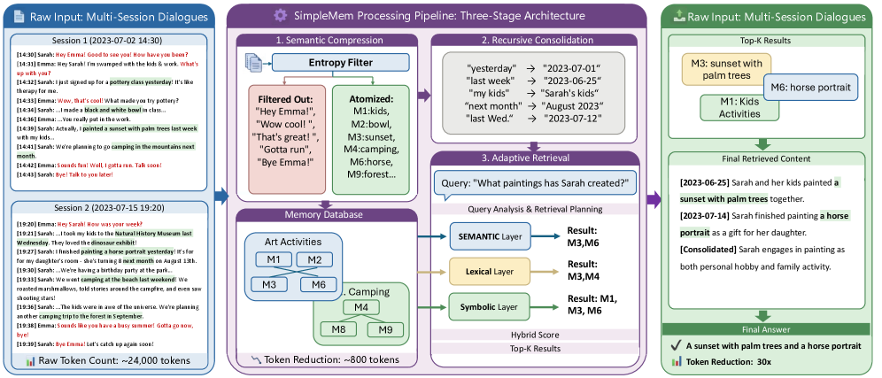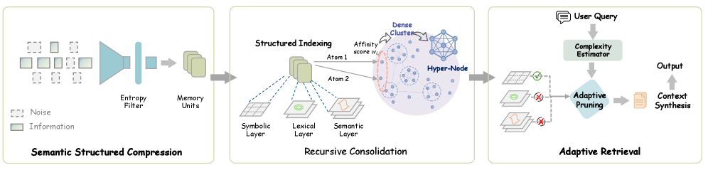 图2:SimpleMem的三阶段架构。左侧是语义结构化压缩阶段,将对话转换为原子事实;中间是递归整合阶段,将相关原子事实合成为高阶"分子"洞察;右侧是自适应检索阶段,根据查询复杂度动态调整检索深度。