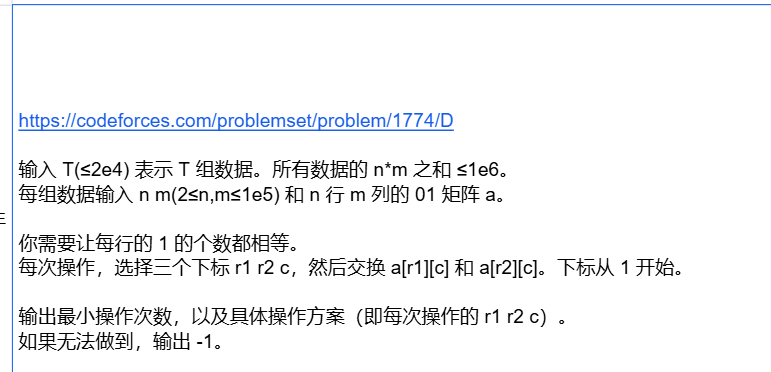 考虑行的构造不好构,注意到每次换的都是同一列的两个,列之间是不会互相影响的,于是可以考虑逐列交换。最终每一行都应该有 t o t / n tot/n tot/n个 1 1 1,因此每一列,我们显然都可以把 1 1 1个数超过这个值的行的1,和个数小于这个值的行的0交换,假设这两种的行分别 x , y x,y x,y个,那么这一列能进行的交换次数就是 min ( x , y ) \min(x,y) min(x,y),方案就是每次从这两个类里各选一个配对。同时,需要更新每一行的 1 1 1个数