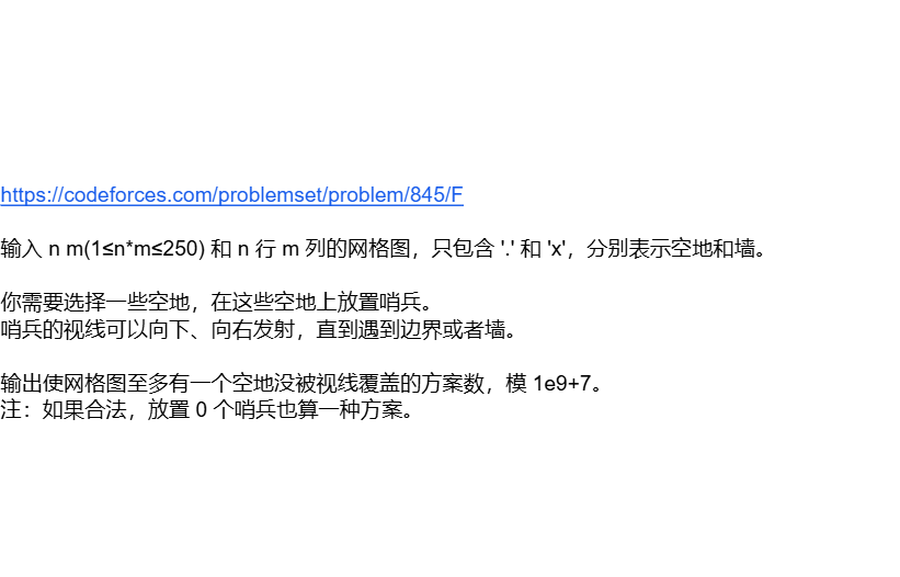 对于本题,就是可以用一个 m a s k mask mask维护有视野的列,扫过每一行,在用一个变量维护当前行到这目前有无向右的视野,如果当前位置有视野,则放不放哨兵都可以,否则必须放哨兵,如果是障碍则不能放哨兵,且会阻断视野。