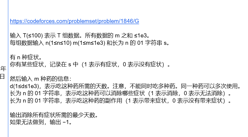 无法dp,因为这个转移不具有无后效性,已经治好的并可能因为新的药物的副作用有复发,但依然存在转移,考虑建图跑最短路。每个患病状态,用上每一种药都能产生一个转移,建有向边,从初始患病状态开始,求到达不患病的最短路