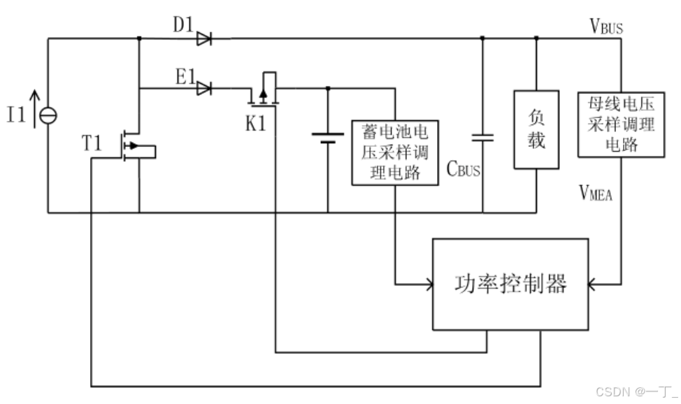 半调节母线是在全调节母线的基础上去掉蓄电池组的放电调节,半调节母线系统电源控制器只调节太阳电池的输出电压,在太阳电池的输出功率能够满足负载需求时,母线电压稳定,蓄电池组输出不调节,通过隔离二极管直接为母线供电,在地影期或联合供电时,母线电压被蓄电池组电压钳位,随蓄电池组电压变化而变化。