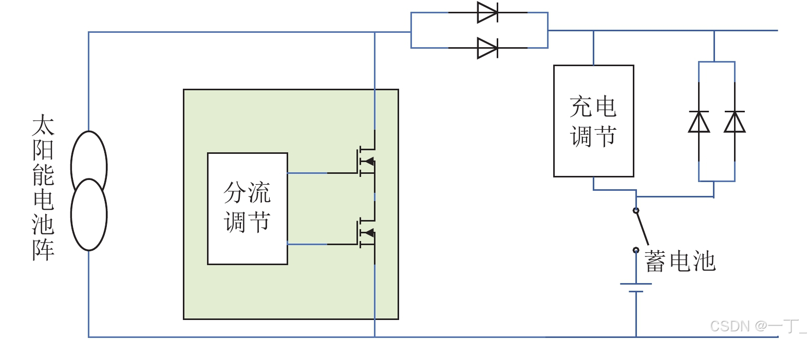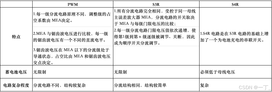 太阳电池阵功率调节分为串联式和并联式,串联式技术为 MPPT 调节,并联式调节可分为顺序线性分流调节和顺序开关分流调节,顺序开关分流调节又分为 PWM 型,S3R 型和 S4R 型。