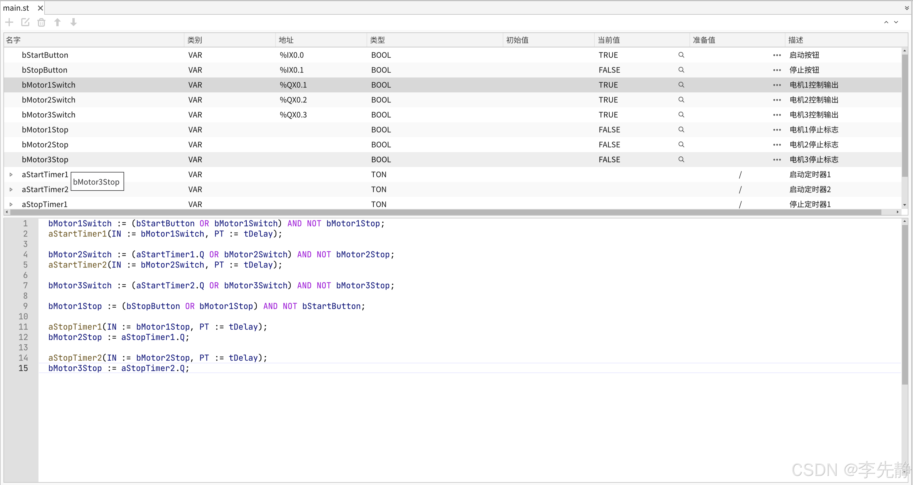| 接触器线圈 | 输出线圈 | bMotorSwitch3 | %QX0.3 | 控制电机3开关 |