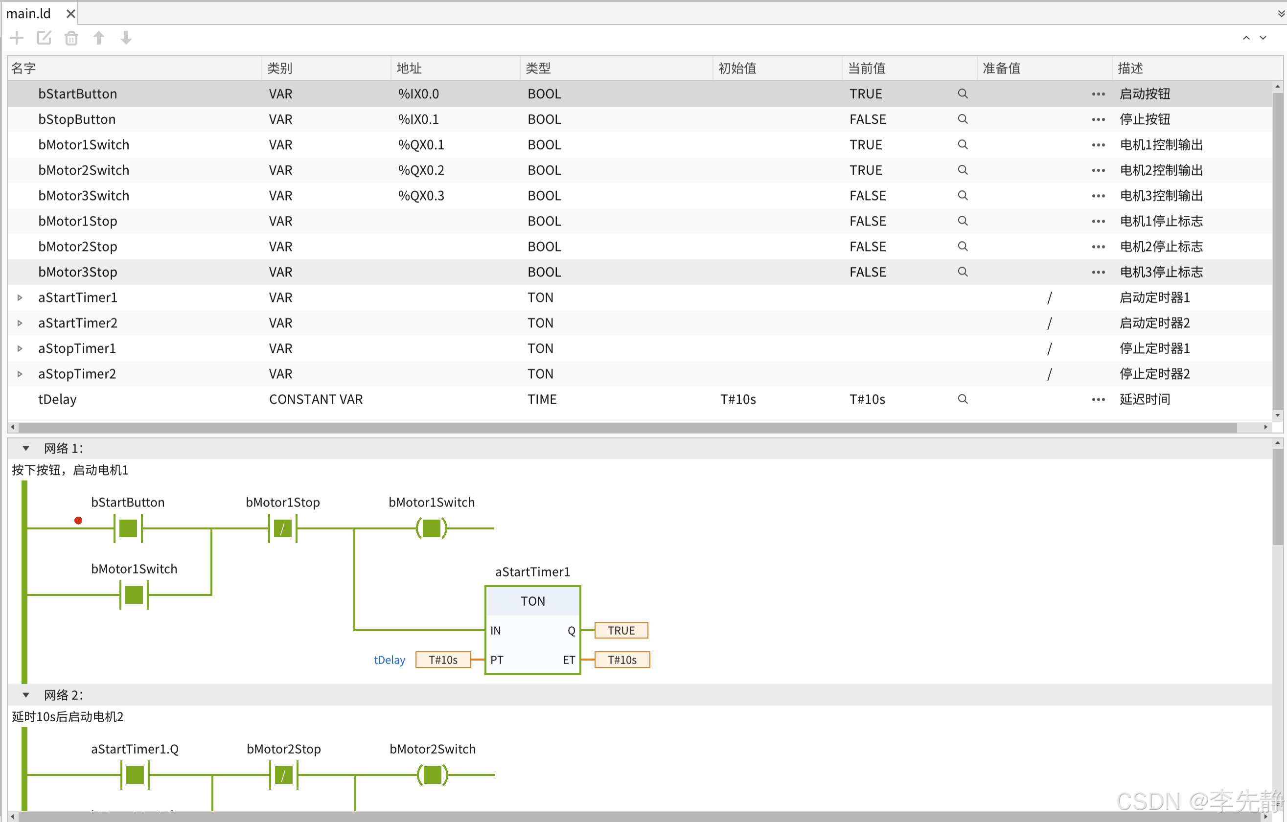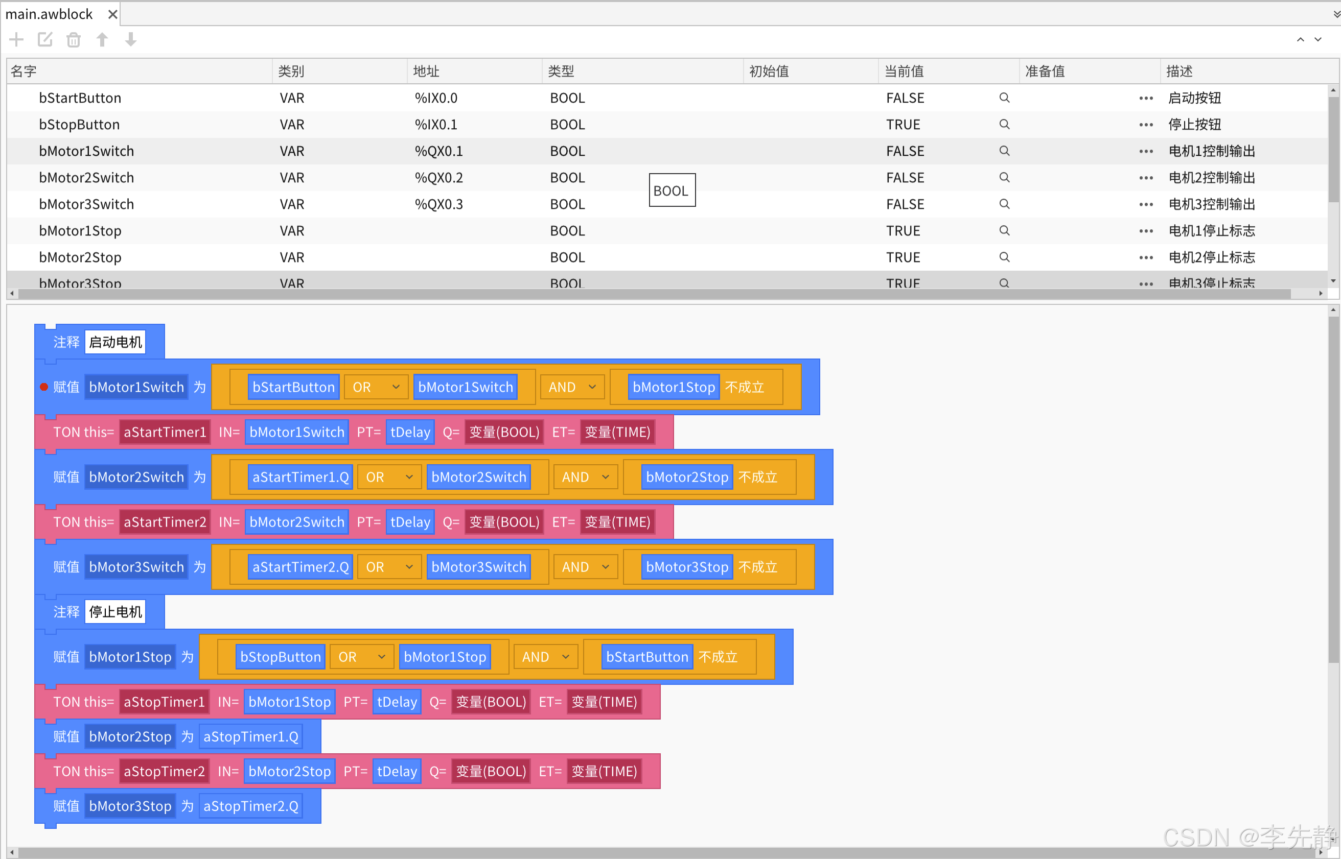AWPLC 目前支持 梯形图、AWBlock 和 ST 语言三种编程,下面用这三种编程语言分别实现延时启动和停止控制逻辑。