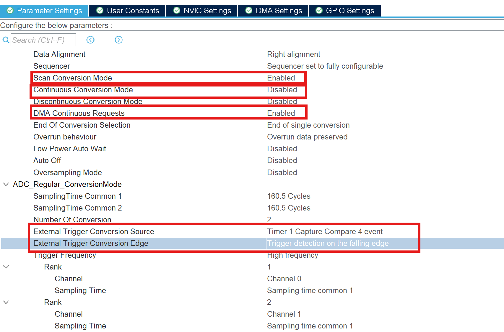 - External Trigger Conversion Source: Timer 1 Capture Compare 4 event