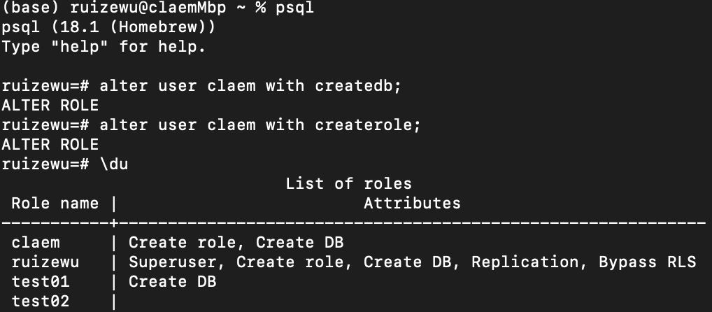 登陆supersuer为新用户claem增加了创建数据库、创建角色权限。