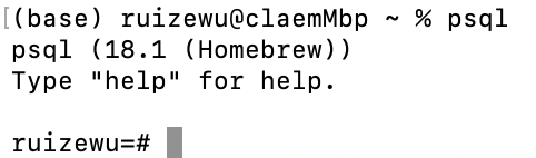 使用' psql ' 即可登陆postgresql,这里如果你不指定任何连接的服务器,端口,用户名,数据库,将会使用默认用户登陆默认数据库,在mac上即使用默认用户(与你apple用户名相同)登陆默认数据库(与你apple用户名相同)。