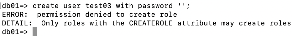 此处我以claem用户登入数据库,该用户没有任何权限,我尝试运行创建新用户命令失败,提示permission denied。