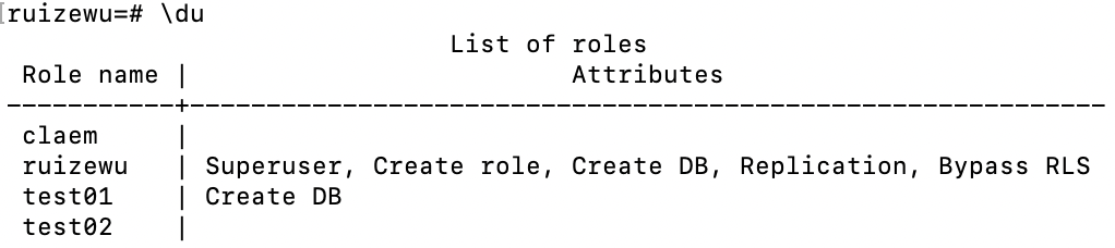 新创建的用户是不具备任何权限的 使用' \du ' 命令查看所有用户的权限: