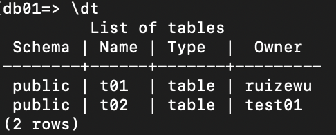 查看数据库db01里的表信息,可以发现存在不同用户创建的表,当前我使用test01用户登陆,尝试查看默认用户创建的表t02,发现没有权限: