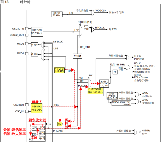 - 最终SYSCLK=(xMHz ÷ x)× 336 ÷ 2 = 168MHz。