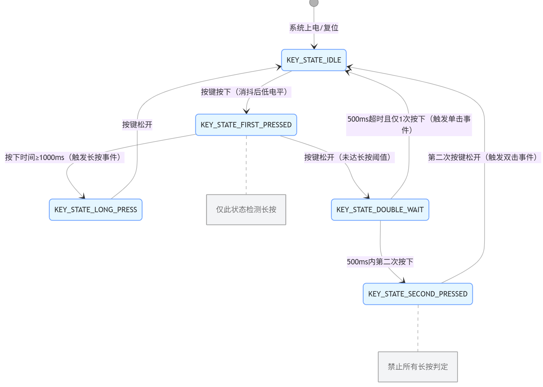状态机通过定义按键的不同状态(空闲、按下、长按、双击等),根据电平变化和时间判断状态转换,可实现单击、双击、长按、短按等复杂按键操作,是实际项目中常用的高级方案。