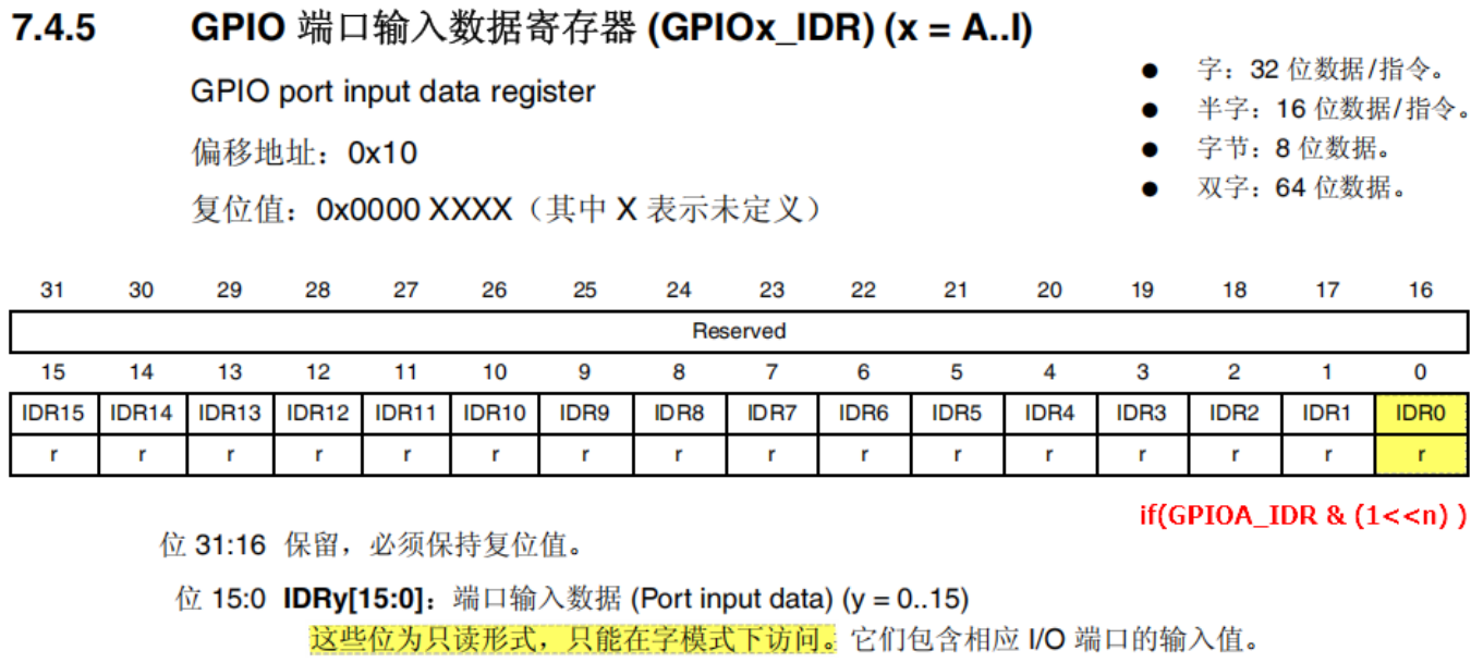 GPIOx_IDR寄存器为32位只读寄存器,低16位对应16个IO口的输入状态(高电平为1,低电平为0),高16位保留。
