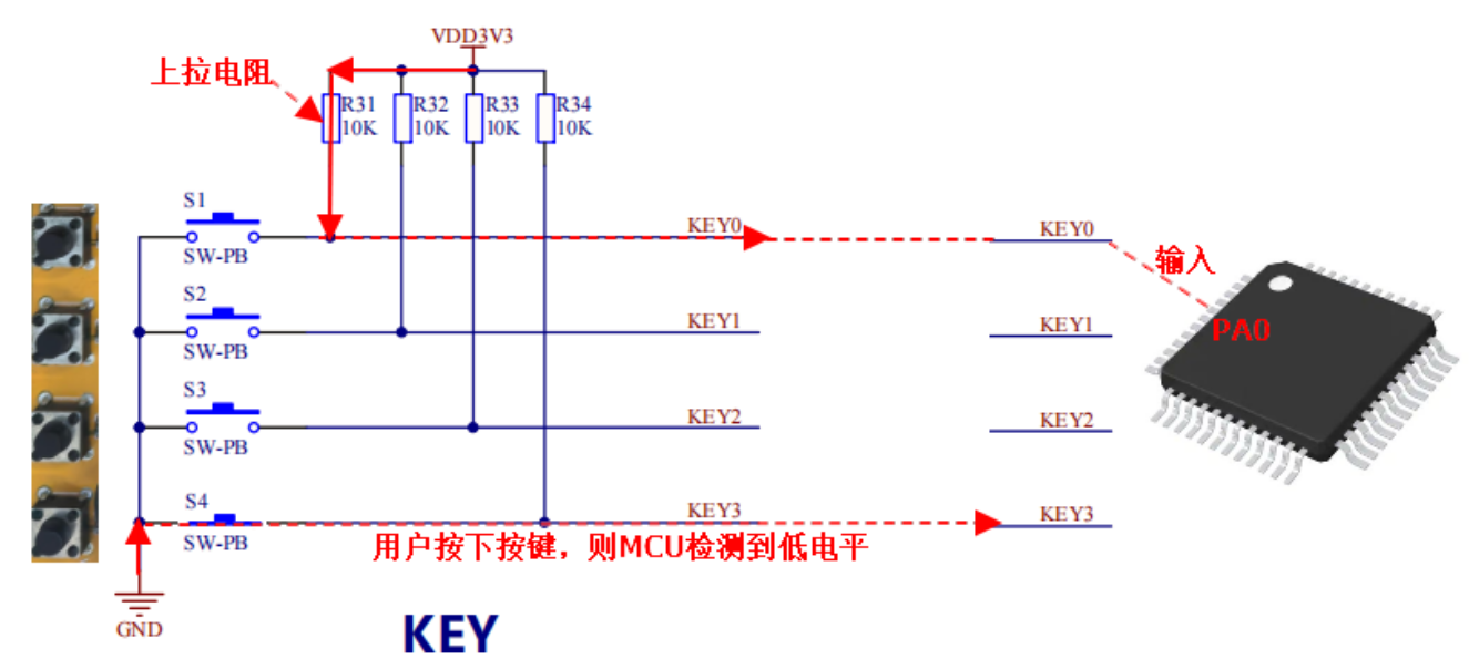 典型按键电路采用上拉电阻设计:IO口通过10KΩ上拉电阻连接VDD(3.3V),按键另一端接地。