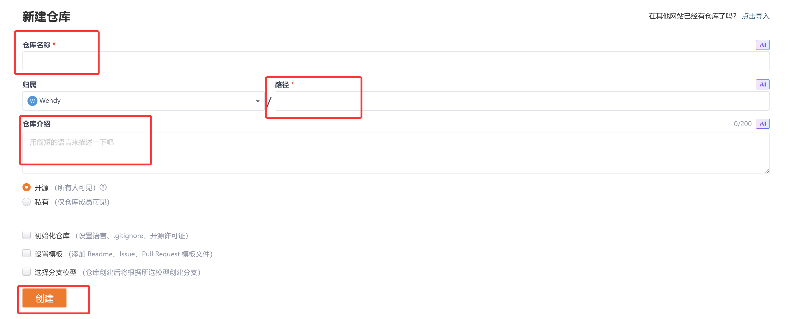 - 输入仓库名称、描述
