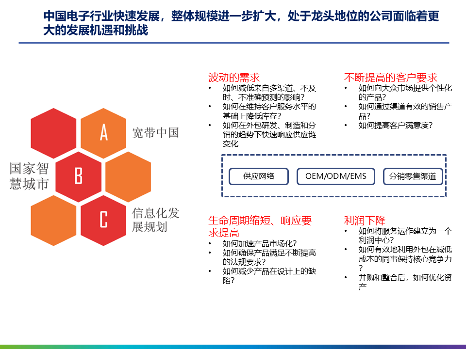- 行业挑战:电子行业快速发展,企业面临需求波动、客户要求提高、产品生命周期缩短和利润下降等挑战7。