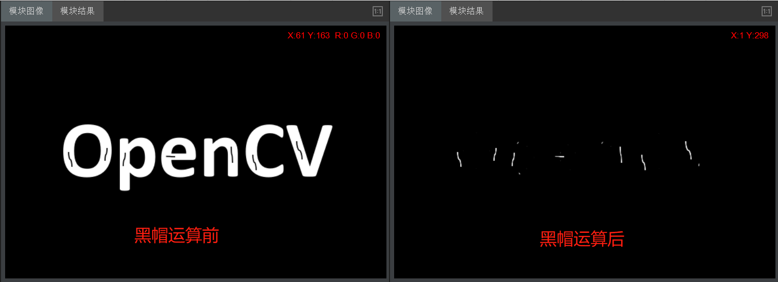 黑帽=原图-闭运算,闭运算后,白色区域内部的小黑区域被去掉,原图减闭运算,得到被去掉的小黑区域。