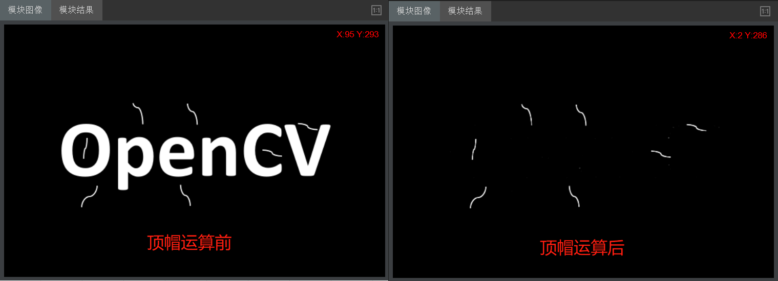 顶帽=原图-开运算,开运算后,白色小区域被去掉,原图减开运算,得到被去掉的小白色区域。