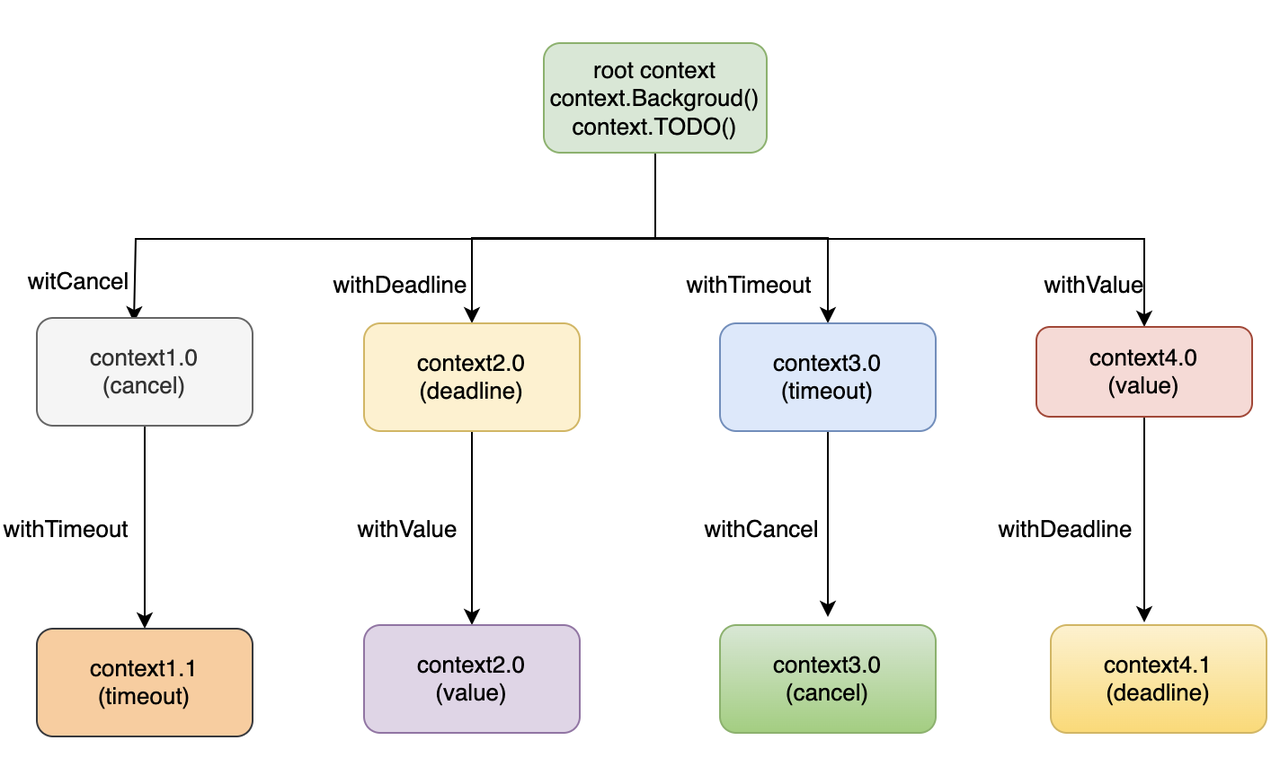 基于当前context,每个with函数都会创建出一个新的context,这样类似于我们熟悉的树结构,当前context称为父context,派生出的新context称为子context。就像下面的context树结构: