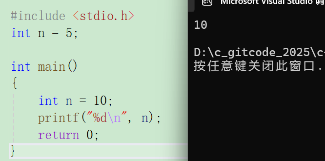 c#include <stdio.h> int n = 5; int main() { int n = 10; printf("%d\n",n); return 0; }结果: