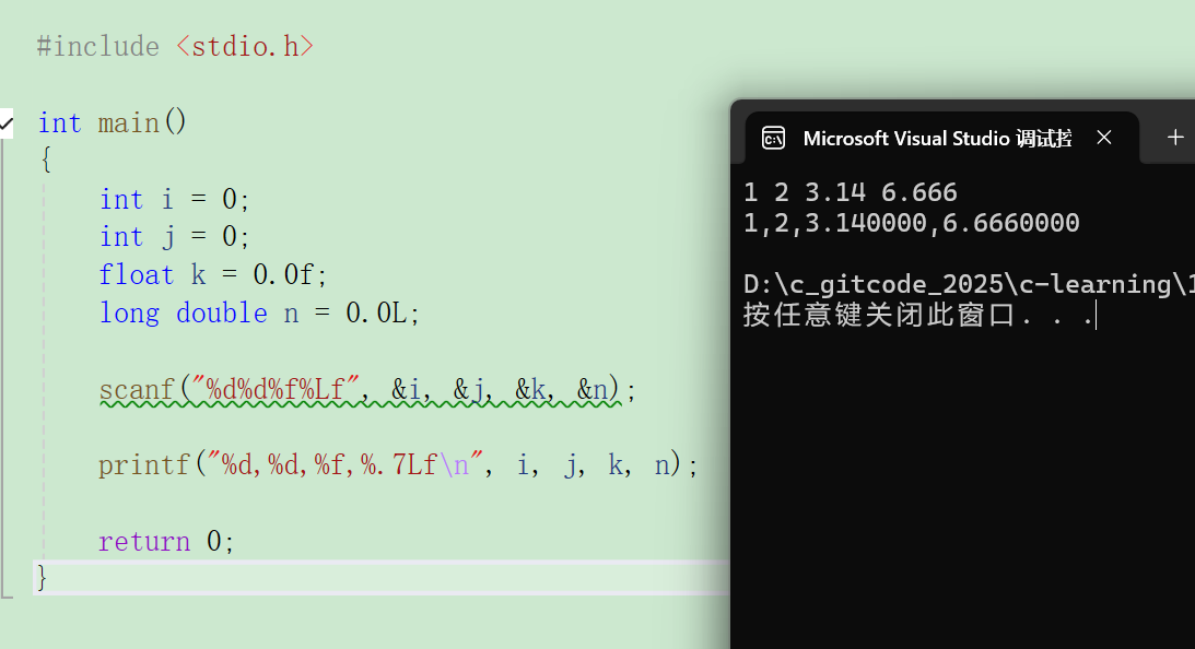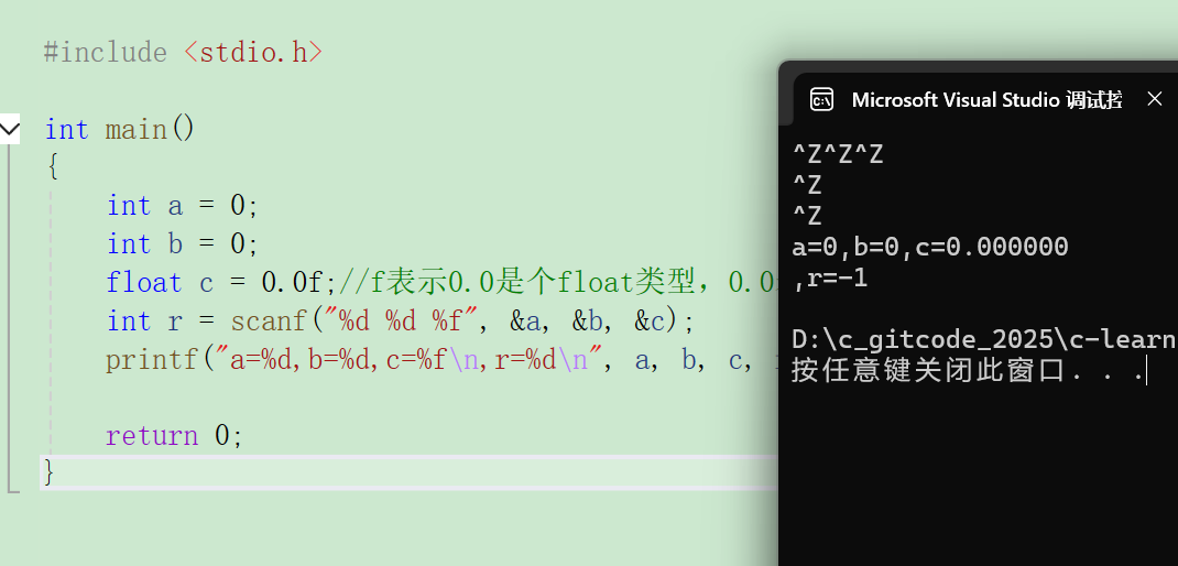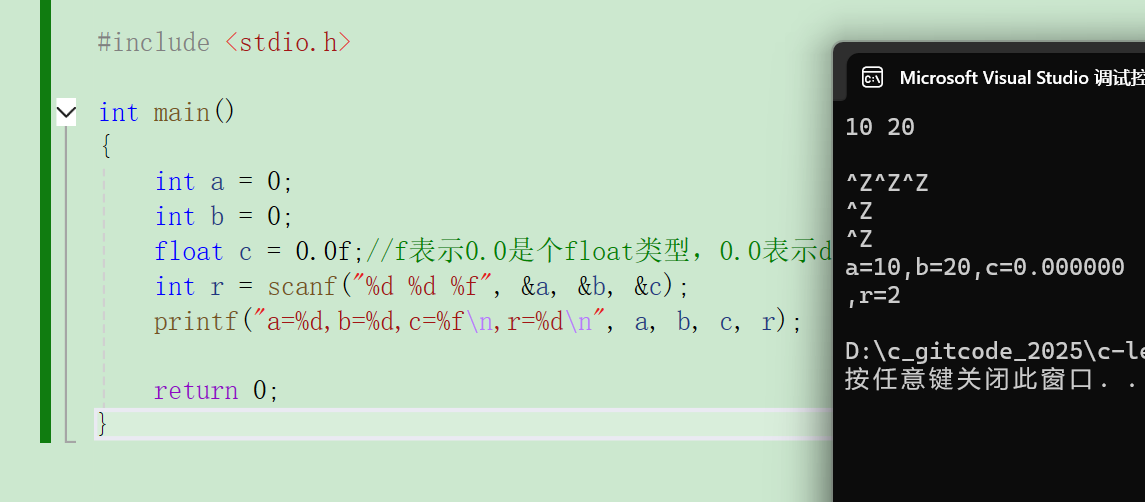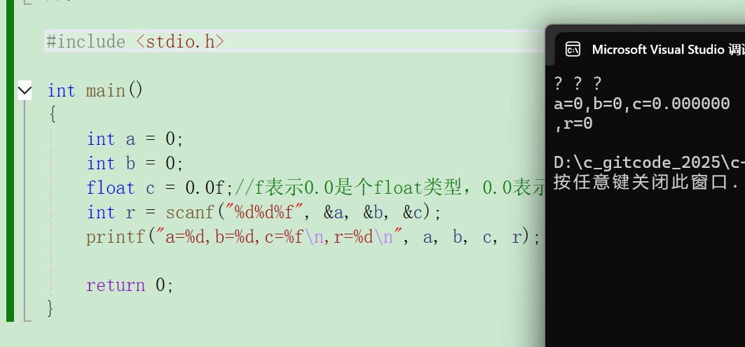 c#include <stdio.h> int main() { int a = 0; int b = 0; float c = 0.0f;//f表示0.0是个float类型,0.0表示double类型,0.0L表示long double类型 int r = scanf("%d %d %f",&a,&b,&c); printf("a=%d,b=%d,c=%f\n,r=%d\n",a,b,c,r); return 0; }