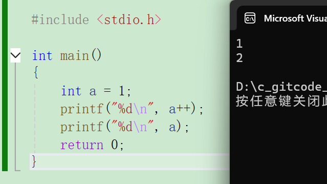 c#include <stdio.h> int main() { int a = 1; printf("%d\n",a++); printf("%d\n",a); return 0; }结果: