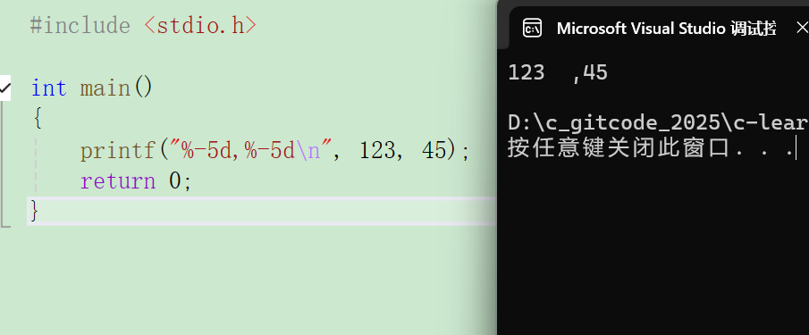 printf("%-5d,%-5d\n",123,45);