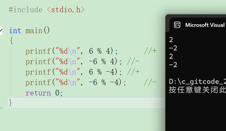 c#include <stdio.h> int main() { printf("%d\n",6%4); //+ printf("%d\n",-6%4); //- printf("%d\n",6%-4); //+ printf("%d\n",-6%-4); //- return 0; }结果: