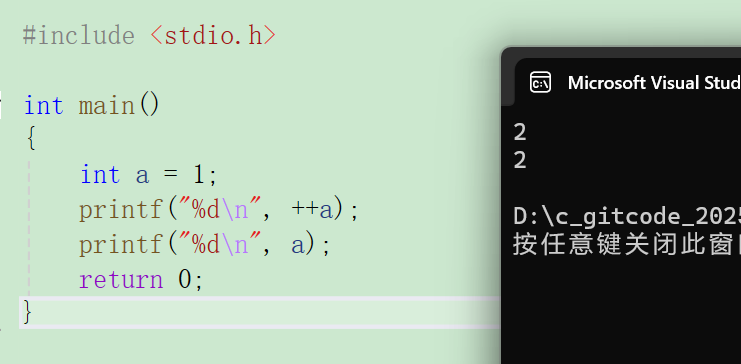 c#include <stdio.h> int main() { int a = 1; printf("%d\n",++a); printf("%d\n",a); return 0; }结果: