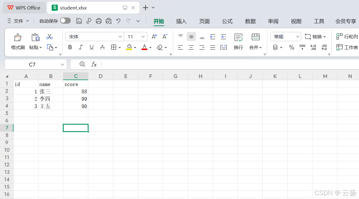 首先创建一个Excel文件student.xlsx,录入需要迁移的数据。以学生成绩表为例,数据结构如下: