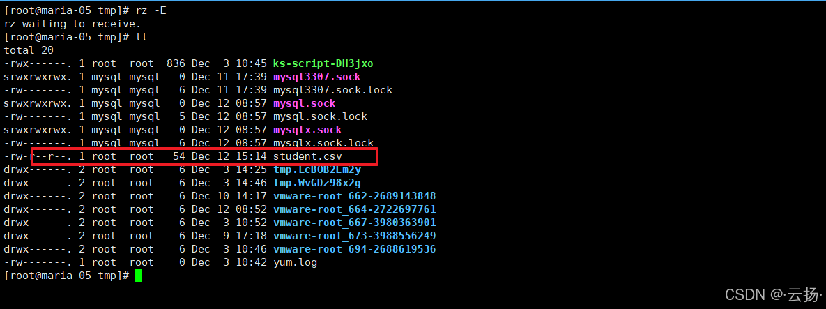 rz命令,会弹出本地文件选择框,选中student.csv拖入,完成上传; -