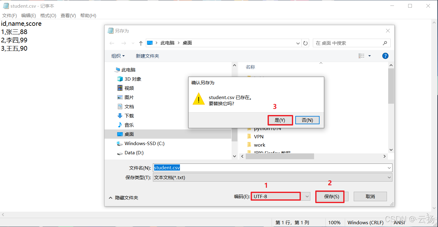 student.csv; - 点击「文件」-「另存为」,在「编码」下拉框中选择「UTF-8」;