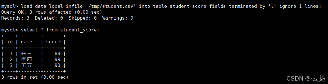 核心命令是load data,指定CSV路径、字段分隔符和忽略表头(CSV第一行是表头,不用导入):