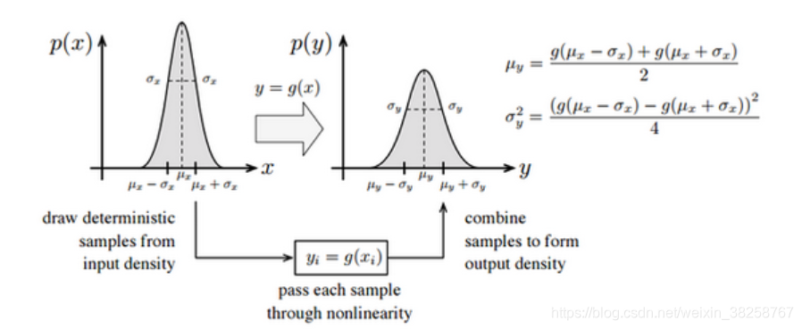 为理解无迹变换的思想,首先分析如下基础问题:设 X X X 为服从正态分布的一维随机变量, Y Y Y 为随机变量 X X X 经非线性映射得到的随机变量,求解随机变量 Y Y Y 的数学期望与方差。