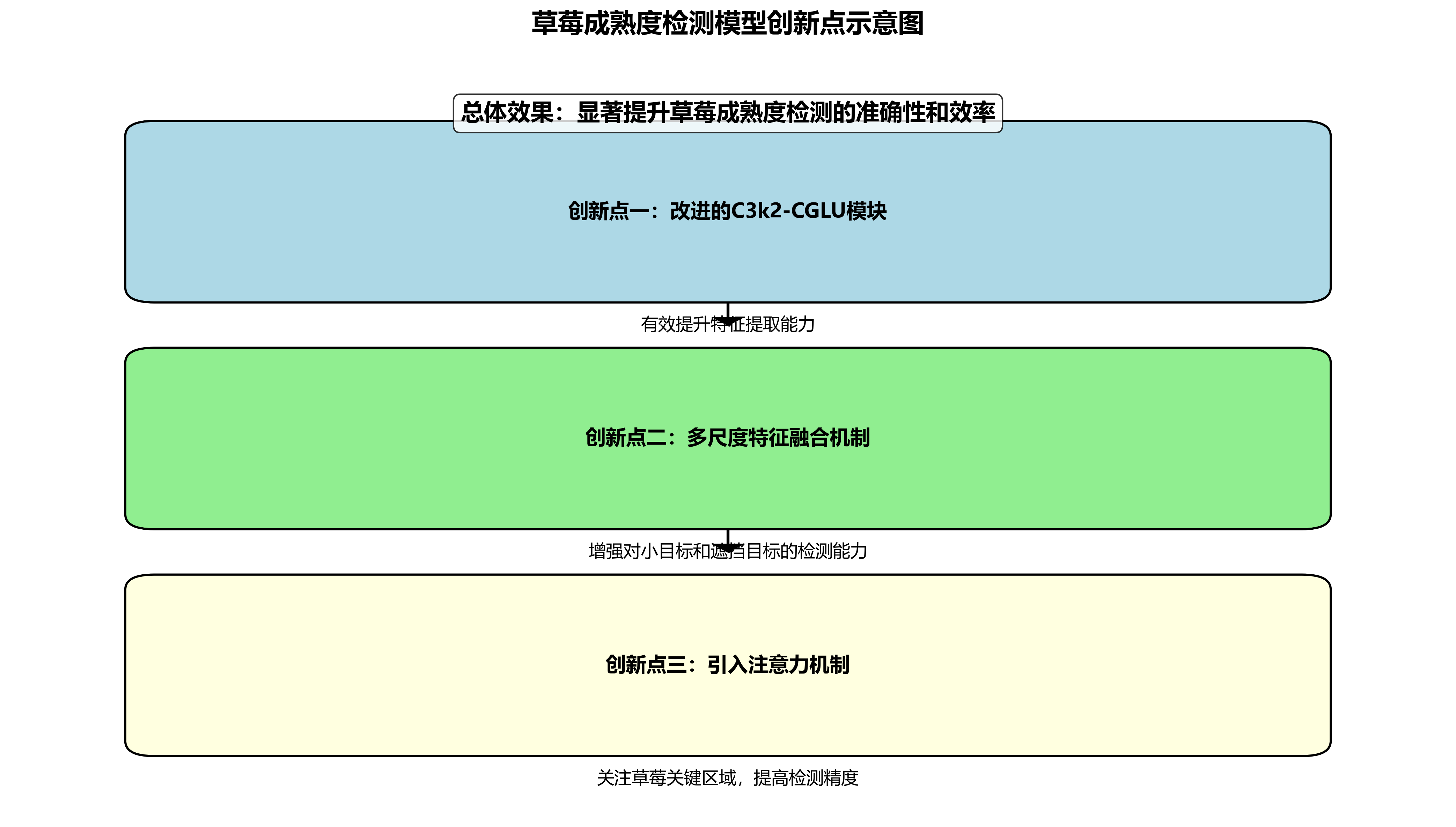 本研究的创新点主要体现在三个方面:一是提出了改进的C3k2-CGLU模块,有效提升了特征提取能力;二是设计了多尺度特征融合机制,增强了模型对小目标和遮挡目标的检测能力;三是引入了注意力机制,使模型能够更加关注草莓的关键区域,提高了检测精度。这些创新点共同作用,显著提升了草莓成熟度检测的准确性和效率。