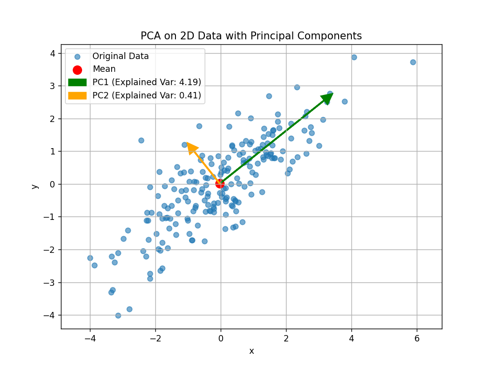 PCA 会找到这条主方向 (第一主成分),再找与之垂直的次方向(第二主成分)。