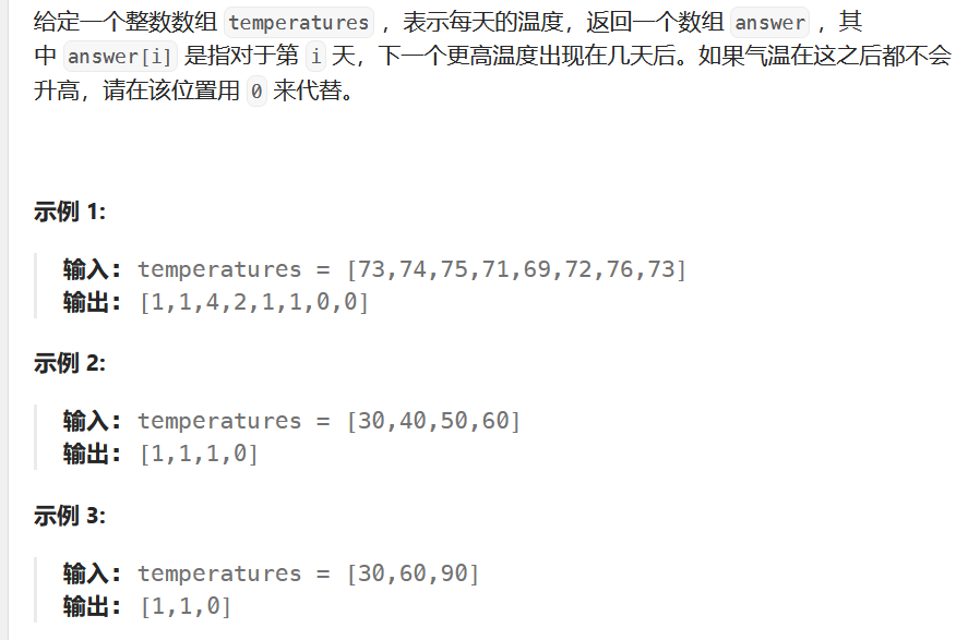 - 当遇到一个新温度时,如果它比栈顶那天的温度高,说明栈顶那天"等到了"更暖和的一天,就可以弹出栈顶,计算等待天数。