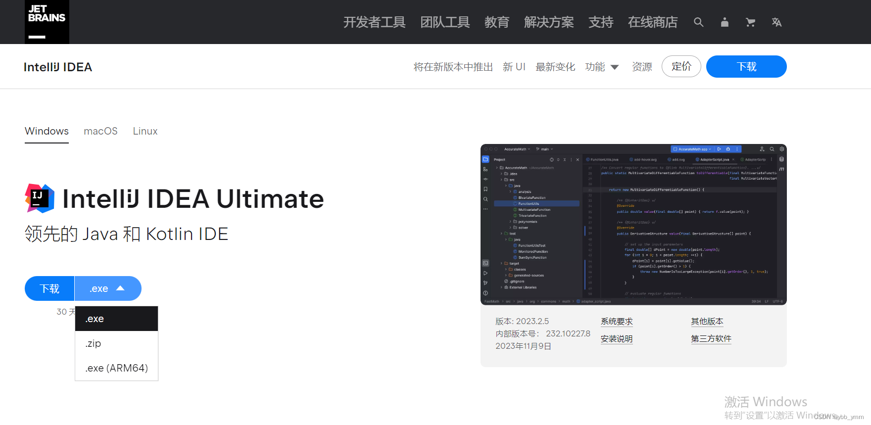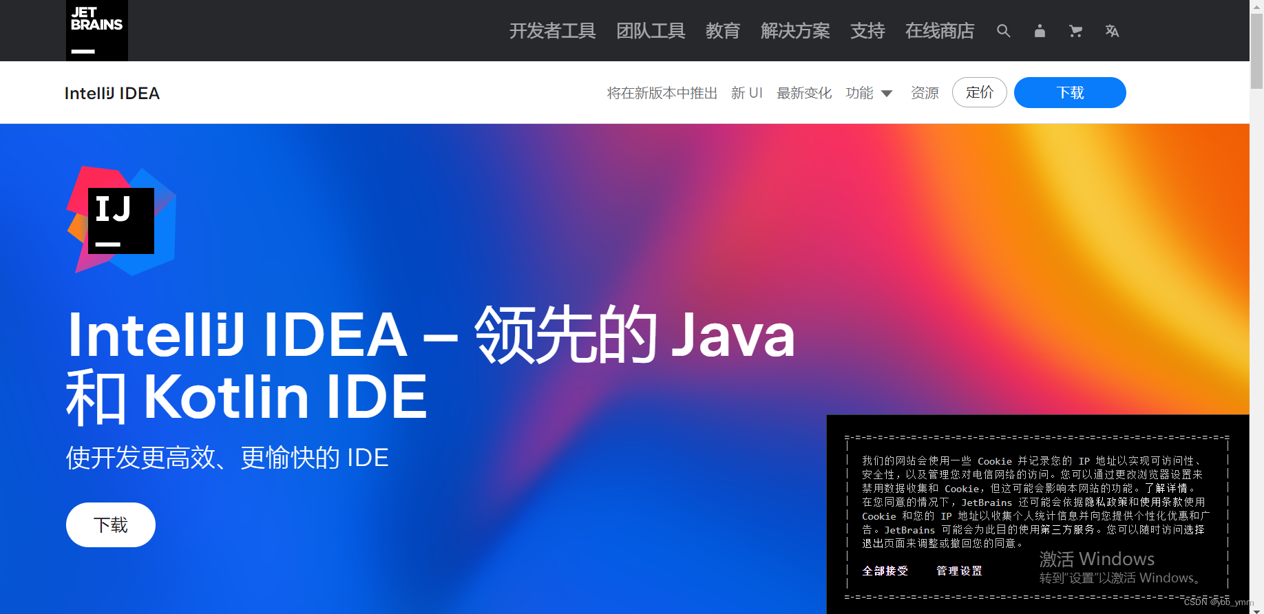 观望中我们可以看到idea的一些简介, 以及他的下载路径按钮。我们可以根据自己的需要选择自己想要的版本下载。